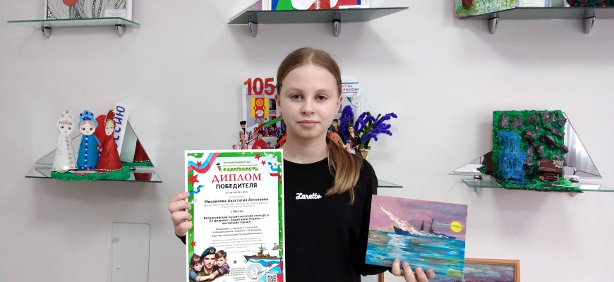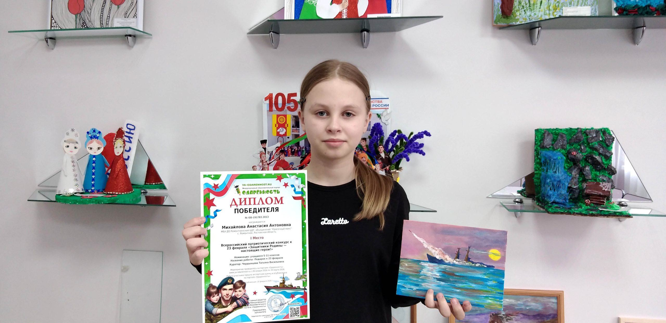 В феврале текущего года она одержала победу во Всероссийском патриотическом конкурсе «Защитники Родины — настоящие герои!» на престижном образовательном портале «Одарённость». Настя представила жюри картину, выполненную маслом на холсте, посвящённую военной тематике и озаглавленную «Подарок к 23 февраля». Картину она посвятила своему любимому дедушке. Но успехи юной художницы на этом не закончились. Совсем недавно Настя вновь стала призером районного конкурса «Таланты без границ» в номинации «Изобразительное искусство». Таким образом, свою небольшую коллекцию достижений она пополнила двумя яркими и значимыми наградами.