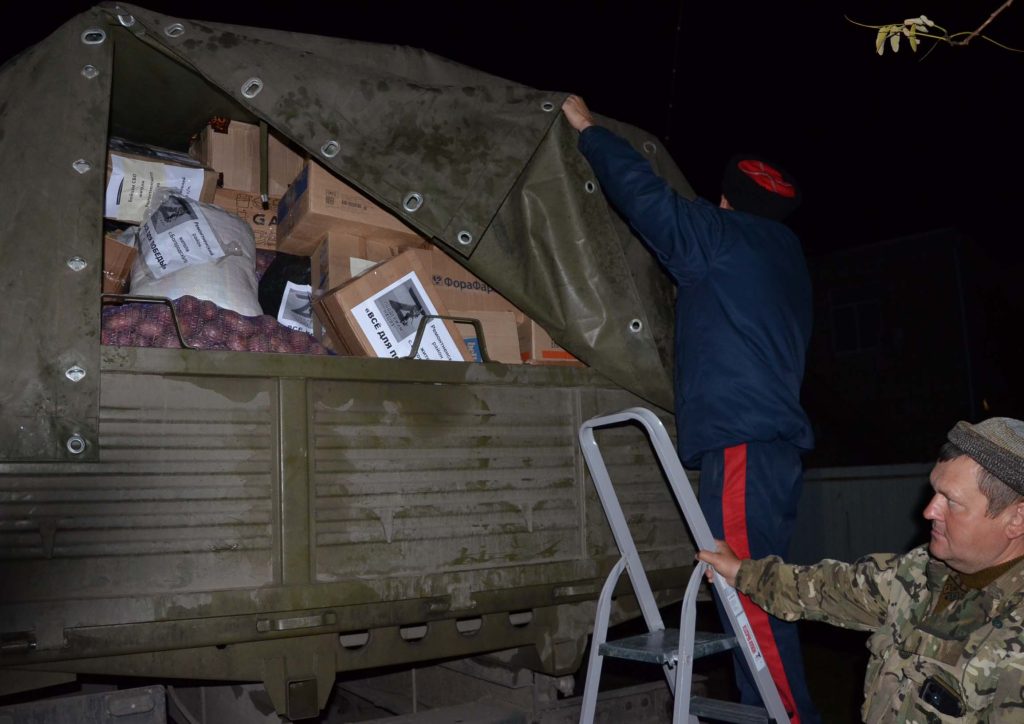 Большой военный «Урал», в пять утра вышедший из пункта «А», дошел в пункт «Б» — к нам. Был уже поздний вечер, на улице темно и срывался дождик. На подмогу волонтерам пришли казаки Ремонтненской дружины, которые, вот уже сколько проводилось подобных акций, всегда откликаются и помогают, а точнее сказать, берут на себя самые тяжелые коробки и упаковки. С энтузиазмом откликнулся и юный ремонтненец Павел.