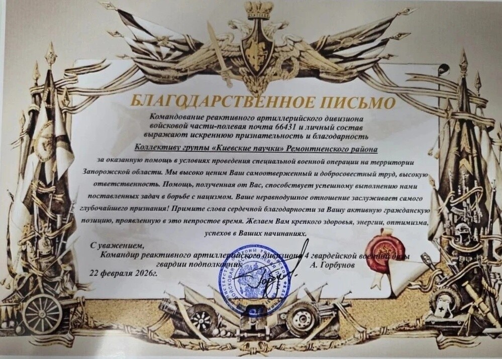 «Командование реактивного артиллерийского дивизиона войсковой части – полевая почта 66431 и личный состав выражают искреннюю признательность и благодарность коллективу группы «киевские паучки» Ремонтненского района за оказанную помощь в условиях проведения специальной военной операции на территории Запорожской области. Мы высоко ценим ваш самоотверженный и добросовестный труд, высокую ответственность. Помощь, полученная от вас, способствует успешному выполнению нами поставленных задач в борьбе с нацизмом. Ваше неравнодушное отношение заслуживает самого глубочайшего признания. Примите слова сердечной благодарности за вашу активную гражданскую позицию, проявленную в это непростое время. Желаем вам крепкого здоровья, энергии, оптимизма, успехов в ваших начинаниях.