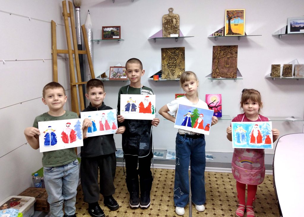 Дети младшего возраста из объединения «Красочный микс» с радостью рисовали главных героев праздника — Деда Мороза и Снегурочку. Их работы полны улыбок, ярких красок и простых, но очень верных деталей.