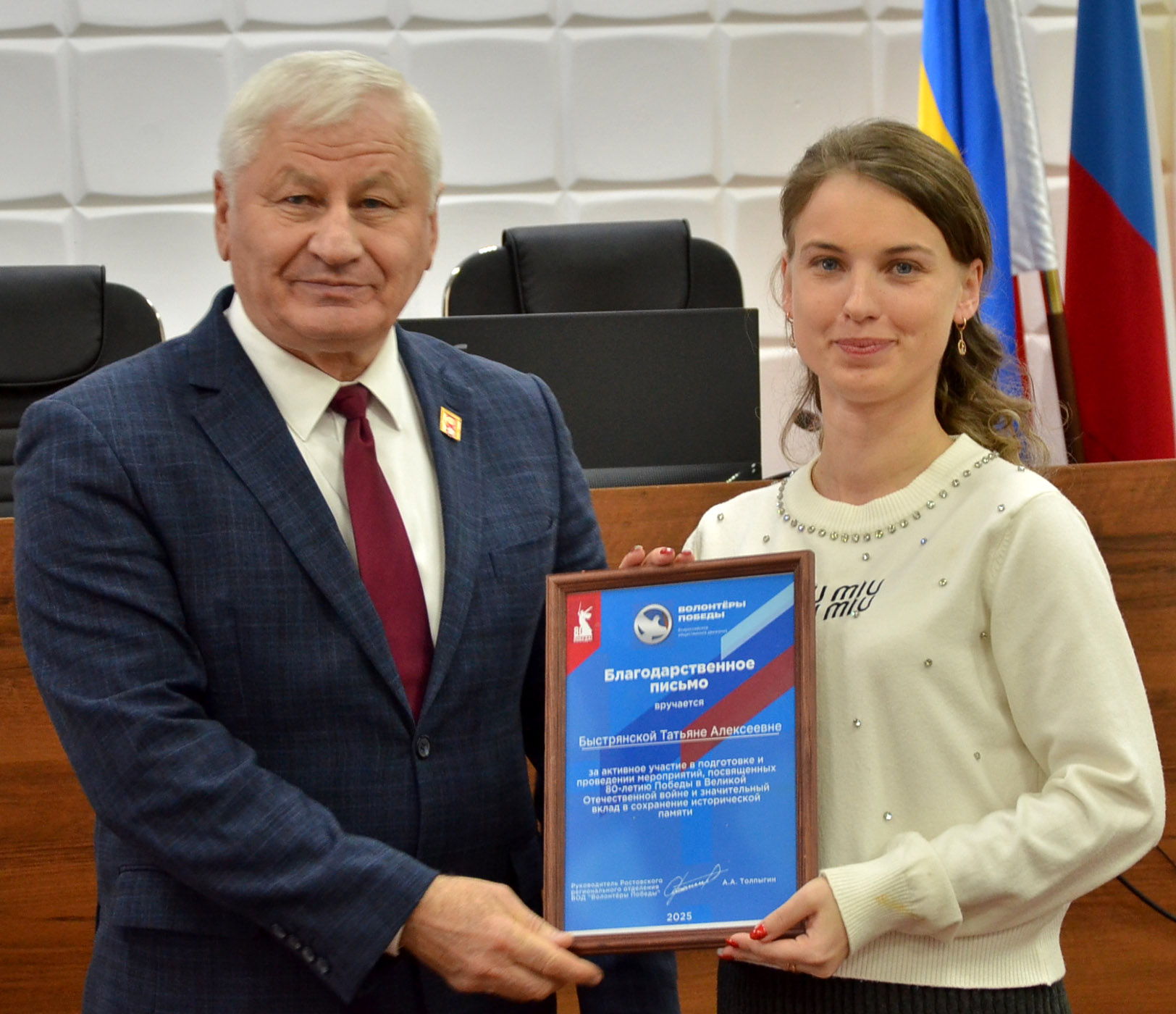 По итогам работы в 2025 году Благодарственным письмом Ростовского регионального отделения Всероссийского общественного движения «Волонтёры Победы» в номинации «Лучший доброволец», занявшая 2 место, награждена Быстрянская Татьяна Алексеевна.
