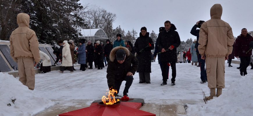 У вечного огня в почетном карауле встали юнармейцы, а на заснеженные плиты, где навечно вписаны имена наших земляков, павших на фронтах Великой Отечественной войны, легли алые гвоздики.