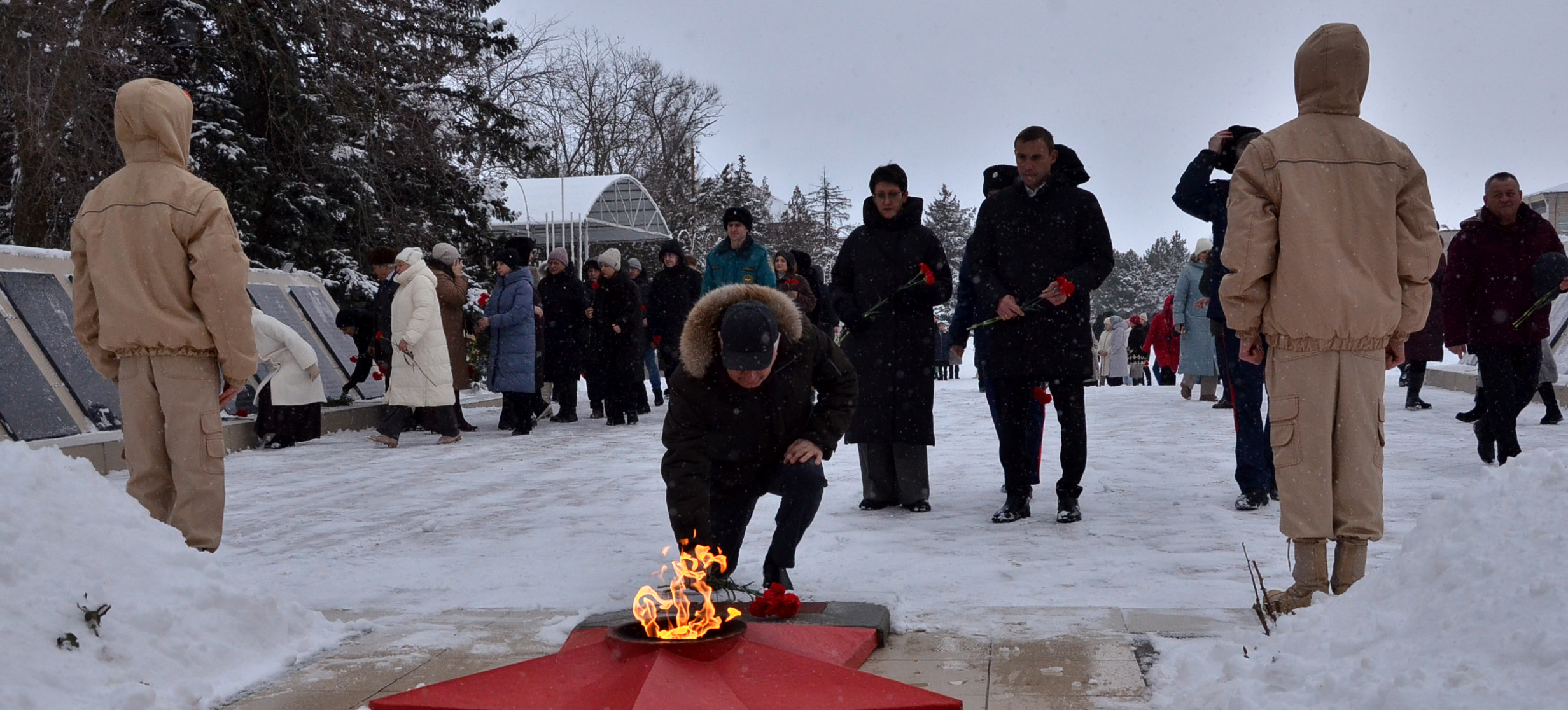 У вечного огня в почетном карауле встали юнармейцы, а на заснеженные плиты, где навечно вписаны имена наших земляков, павших на фронтах Великой Отечественной войны, легли алые гвоздики.