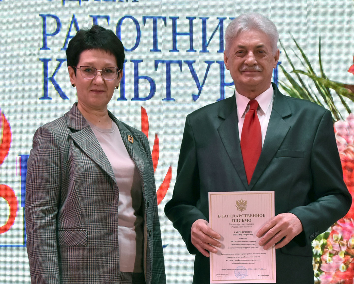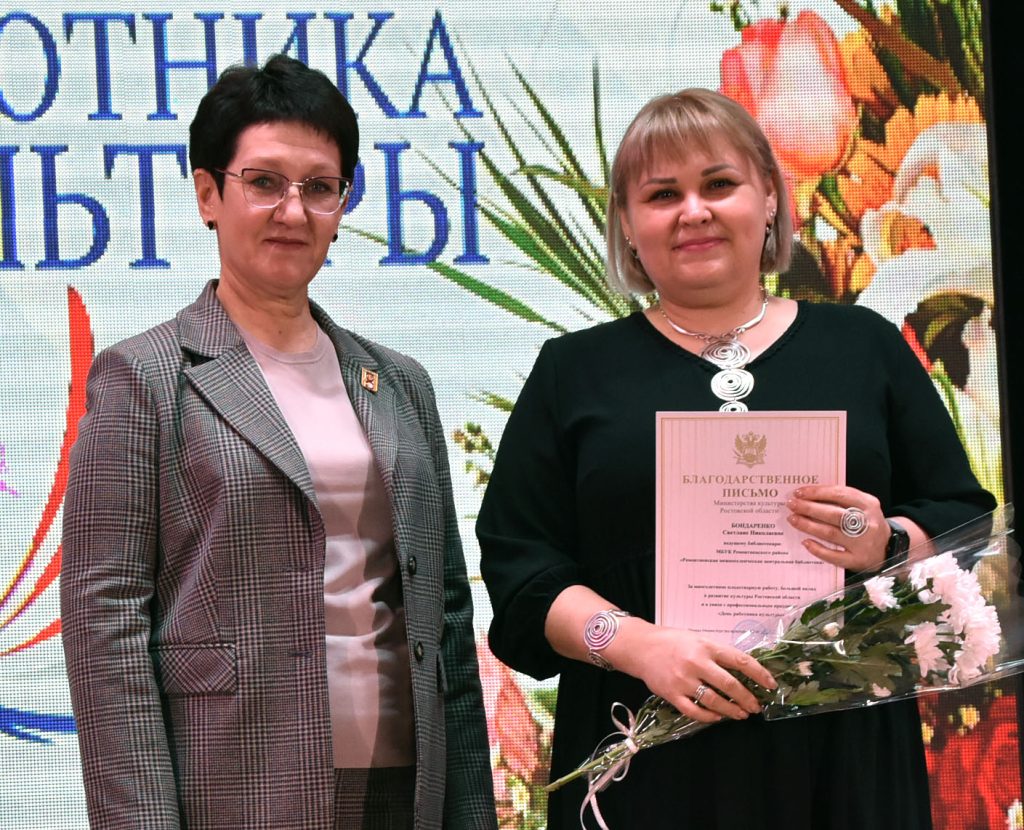 Благодарственным письмом министерства культуры Ростовской области за многолетнюю плодотворную работу, большой вклад в развитие культуры Ростовской области и в связи с профессиональным праздником — Днем работника культуры — награждены: