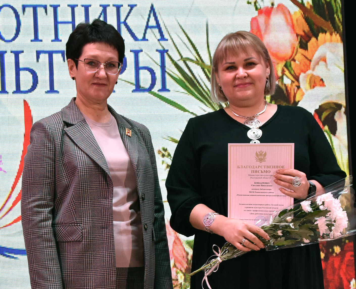 Благодарственное письмо главы Администрации Ремонтненского района за большой личный вклад в развитие и сохранение культуры на селе и в связи с профессиональным праздником вручены: