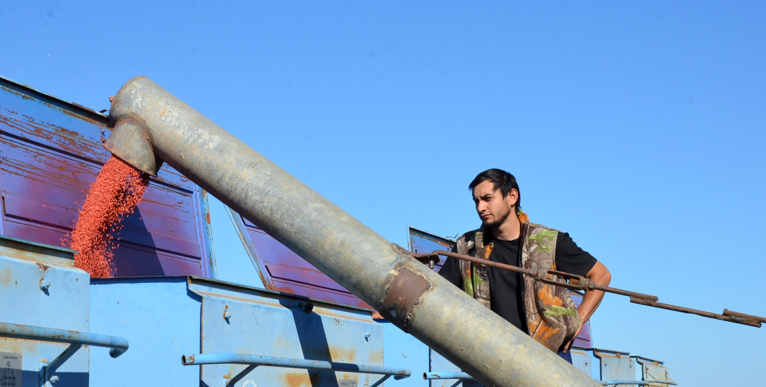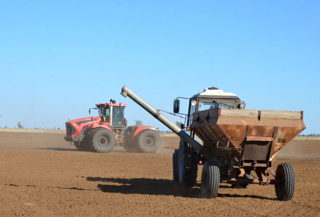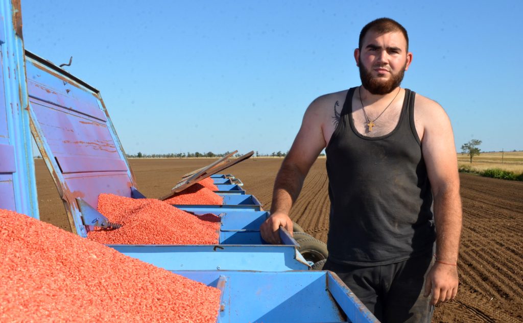 Современный Кировец с 12-ти метровой сеялкой-культиватором, управляет которым Александр Дегтярев, как раз подъехал, чтобы загрузиться семенами. Семена в хозяйстве используют только первой репродукции и сорта, проверенные временем. Ярко-оранжевое зерно (такой цвет ему придает препарат, которым в обязательном порядке протравливают семена) упругой струей поступает со шнека в отсеки сеялки. Подвозит семена к сеялочному агрегату на МТЗ-82 механизатор Иван Ворона. Контролирует подачу семян засыпщик Исмаил Вациев. С прицепа второго трактора, под управлением Сергея Морозова, подается удобрение. Буквально несколько минут и мощный Кировец снова готов к заделке семян.