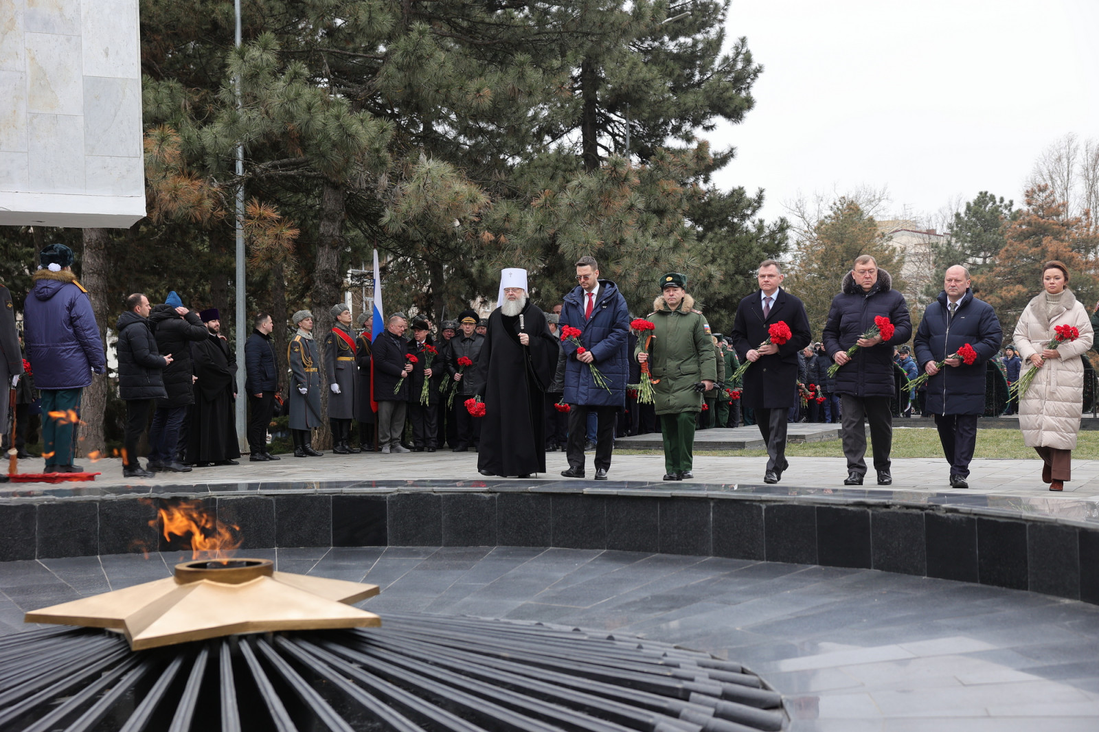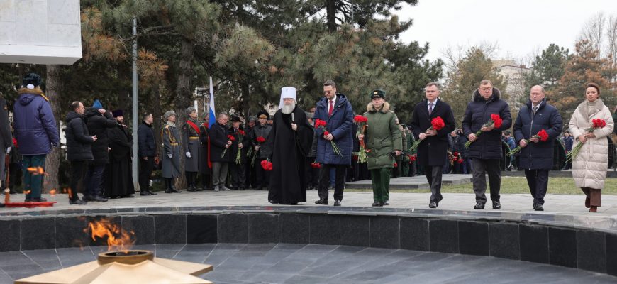 Глава региона, военнослужащие, ветераны и общественники возложили цветы к Вечному огню. Под отсчет метронома собравшиеся почтили минутой молчания память тех, кто отдал свою жизнь за свободу и независимость Отечества.